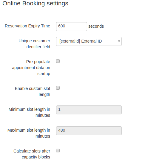 • Calculate slots after capacity blocks - If checked, calculation of available time slots is done after capacity blocks, i.e. if there is a capacity block partly or wholly blocking a time slot interval, the next available time will be calculated at the end of the capacity block instead of at the start of the next time slot interval. For example, if there exists a schedule with opening hours from 08:00-15:00 and with a capacity block from 12:00-13:00, and slot interval and service duration is 2 hours, the available times will be 08:00, 10:00 and 13:00. If the setting is disabled, on the other hand, the available times will be 08:00 and 10:00 since the time slot interval from 12:00-14:00 is blocked by the capacity block. Default: false.