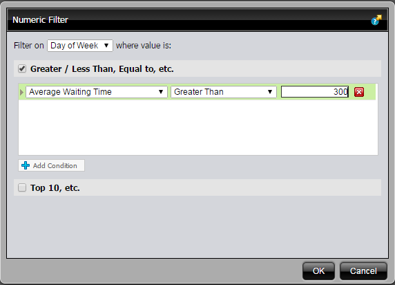 The filter in our example now reads out as “Average Waiting Time is greater than 300 for each Day of Week”.