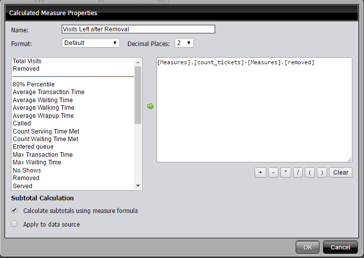 5. Select the Calculate subtotals using measure formula check box to use this calculated measure when adding up subtotals in your report. Clear this check box to not use this formula when calculating subtotals.