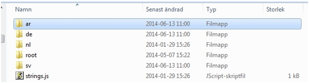 All sub-folders except the 'root' folder contains the .js file for a particular language as specified by the name of the folder using the standard 2-letter language code, e.g. ar = Arabic, de = German, sv = Swedish etc.