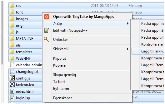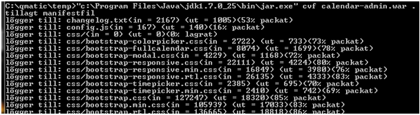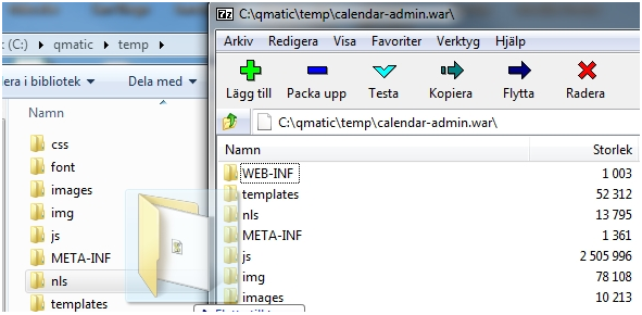 b Another method is to use the c:\qmatic\temp folder created in step 2 of this guide, which contains all the content of the original calendar-admin.war plus the original calendar-admin.war archive file. Select all files except the calendar-admin.war and use 7-zip (or similar) to create a new calendar-admin.war archive. (Remember that a Java.war/.jar/.ear is just a standard zip file with another suffix).