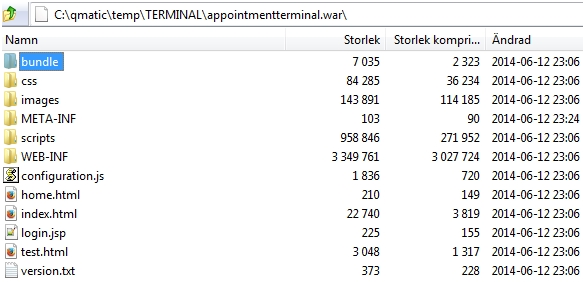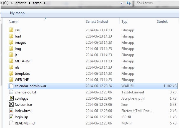 2. Copy the .war file to a temporary location such as c:\qmatic\temp and extract the .war file using 7-zip, WinRAR, or similar. To unzip or jar xvf calendar-admin.war on a Linux command shell. You should see something similar to the screen shot below: