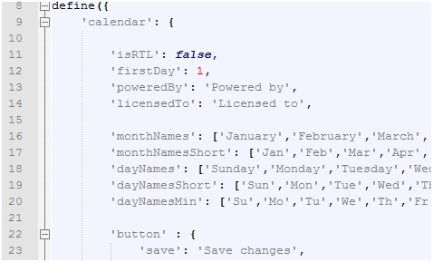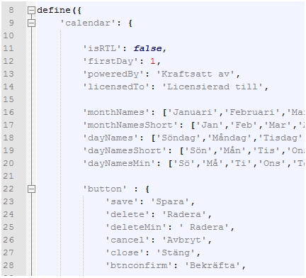 The document starts with a require.js define(..) function call whose single argument is a JSON document. As seen above, this JSON document has a root element named 'calendar' with a number of sub-elements both being other JSON objects but also plain key-value pairs. For example, we see the 'button' sub group of translated values where translated button names have been grouped together. We also see usage of arrays such as the 'dayNames':[…] array where a translated name for each day of the week can be specified for a given weekday index.