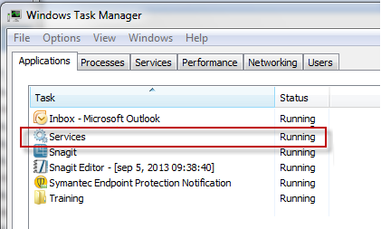 3. Open the Windows Task Manager and ensure that there is no application called “Services” running, as in the picture below. If there is, close the Services application.
