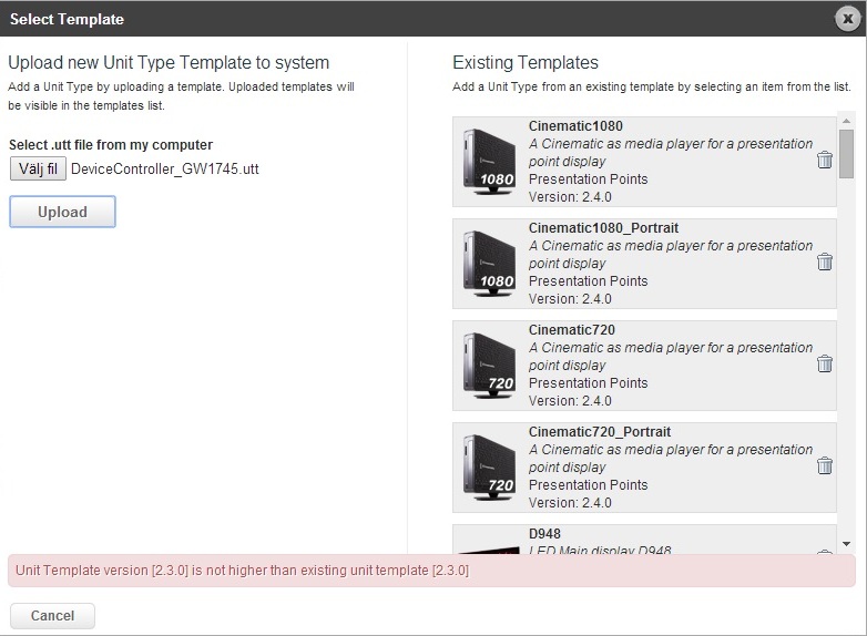 If you try to upload a unit type with the same or lower version, the following message will be displayed:
