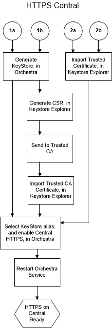The following flow chart illustrates the steps that need to be taken to set up HTTPS for Central. Each number (1a, etc) refers to a certificate type (see See “Different kinds of certificates”.), described by a corresponding section below.
