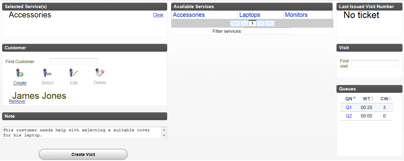 4. Click the Create Visit button. If the Reception has a configured printer, the ticket is printed and can be handed to the Customer.