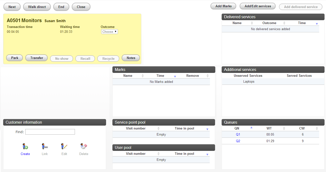 A Customer without a ticket can be entered into the system and called for Service using the Walk direct feature. The Walk direct feature lets you place a virtual ticket into the Service Queue of your choice. The ticket is called immediately following the selection of the Service.